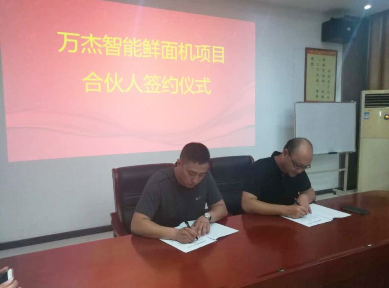 2017年8月11日,萬杰智能鮮面機首輪招商的末尾,令人感動的是,山西省長治市萬福糧油有限公司王總和楊總、江蘇省蘇州市優面糧油食品有限公司蘇總,不愿錯過首輪招商的機會,專程駕車五六個小時,直奔萬杰智能本部,趕在截止時間18:00前完成簽約,成為萬杰智能鮮面機在長治市和蘇州市的合伙人。