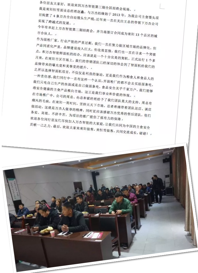 | 2017年12月29日,萬杰智能鮮面機第三期全國招商會和中型生產線新品發布會同時在萬杰智能總部召開。在新的一年即將到來之際,眾多經銷商和糧油界的朋友們寄托新的希望,齊聚萬杰展望未來,共謀未來發展新商機。 為了讓嘉賓們能夠更加深入的了解萬杰智能,主辦方特地安排嘉賓在招商會當天上午參觀萬杰智能工廠,從生產制造中心、研發中心、產品展示廳到遠程控制中心,使嘉賓們充分了解萬杰智能的研發能力和制造實力,深切感受到萬杰智能20年的積累。 經過午餐和簡單的茶歇,嘉賓們齊聚萬杰招商會現場,萬杰智能第三期全國招商大會正式開始。會上,首先由北京先行曾鵬飛為意向合伙人做萬杰智能鮮面機的項目介紹;然后由萬杰智能科技股份有限公司王曉杰董事長做“傳統還在,未來已來”主題報告;最后由來自南陽和新鄉的城市合伙人為意向合伙人分享市場心得和運營經驗,涵蓋了從終端洽談、現場陳列、消費者溝通等眾多細節,內容豐富全面,引來現場不少嘉賓的共鳴。 由于萬杰智能鮮面機擁有出色的產品力和科學的商業模式,現場不少嘉賓都對萬杰智能鮮面機項目產生了濃厚的興趣。目前,萬杰智能的相關工作人員正在和有合作意向的嘉賓就合作細節,進行深度的商談接洽。 本次招商會的順利召開,為中國的傳統制造行業注入了一股新的活力。未來,萬杰智能將繼續堅持科技智能創新,為中國的老百姓創造更多更好的智能主食機械,為中國億萬家庭的主食安全保駕護航。 招商會花絮 |