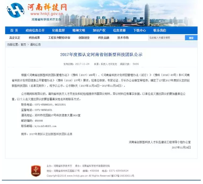 2017年度擬認定河南省創新型科技團隊公示(原文鏈接)